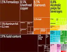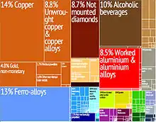 | کالاهای صادراتی | چدن، مس خام، فلزات غیرآهنی، الماس، محصولات معدنی، مواد غذایی، انرژی[6] |