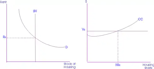 در نمودار مجاور، سهام عرضه مسکن در پانل سمت چپ ارائه میشود در حالی که جریان جدید در پانل سمت راست قرار دارد. در مکانیسم تنظیم اولیه چهار مرحله وجود دارد. اول، قیمت تعادل اولیه (Ro) با تقاطع عرضه سهام مسکن موجود (SH) و تقاضای مسکن (D) تعیین میشود. سپس این اجاره از طریق تخفیف جریانهای نقدی به ارزش (Vo) ترجمه میشود. ارزش با تقسیم اجاره بهاء دوره جاری بر نرخ تخفیف محاسبه میشود، که یعنی دائمی تلقی میشود. سپس ارزش به منظور تعیین اینکه آیا فرصتهای سودآور برای توسعه دهندگان وجود دارد، با هزینههای ساخت و ساز (CC) مقایسه میشود. تقاطع هزینه ساخت و ساز و ارزش خدمات مسکن، حداکثر سطح مسکن جدید (HSo) را تعیین میکند. سرانجام میزان ساخت مسکن در دوره فعلی به میزان ساخت مسکن در دوره بعدی اضافه میشود. در دوره بعدی، منحنی تأمین SH به مقدار HSo به راست منتقل میشود.