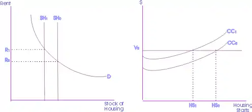 نمودار سمت راست اثرات افزایش هزینه در کوتاه مدت را نشان میدهد. اگر هزینههای ساخت و ساز افزایش یابد (از CCo به CC1 بگویید)، توسعه دهندگان تجارت خود را کم سود تر مییابند و در سرمایهگذاری خود انتخابی تر خواهند بود. علاوه بر این برخی از توسعه دهندگان ممکن است صنعت را ترک کنند. میزان شروع مسکن کاهش مییابد (HSo به HS1). این امر در نهایت باعث کاهش سطح عرضه (از SHo تا SH1) میشود زیرا موجودی مسکن کاهش مییابد. تمایل به افزایش خواهد داشت (از Ro تا R1).