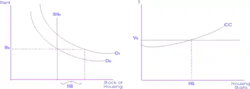 نمودار سمت راست اثرات افزایش تقاضا را در کوتاه مدت نشان میدهد. اگر افزایش تقاضا برای مسکن وجود داشته باشد، مانند تغییر از Do به D1، یا تعدیل قیمت یا کمیت یا هر دو صورت خواهد گرفت. برای اینکه قیمت یکسان بماند، باید عرضه مسکن افزایش یابد. یعنی، عرضه SHo باید توسط HS افزایش یابد.