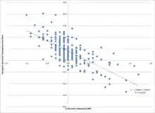 - درحالیکه بعضی از انواع بیکاری صرف نظر از شرایط اقتصاد ممکن است اتفاق بیفتد، بیکاری دورهای زمانی که رشد از حرکت بازمیایستد اتفاق میافتد. قانون اوکان رابطه تجربی میان بیکاری و رشد اقتصادی را نشان میدهد.[8] نسخه اصلی قانون اوکان نشان میدهد ۳ درصد رشد در تولید منجر به ۱درصد کاهش در بیکاری میشود.[9]