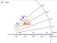 نمودار نشان میدهد که چرخش البیوریگین با دیگر قمرهای موافقگرد زحل مرتبط است. خروج از مرکز مدار بوسیلهٔ بخش زرد که از اوج به حضیض میرسد نشان داده شده است.