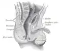 ![]() Symphysis pubis exposed by a coronal section. (Pubic symphysis visible at center left.) | |