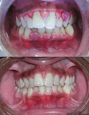 | Severe gingivitis before (top) and after (bottom) a thorough mechanical debridement of the teeth and adjacent gum tissues | |