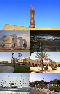 ![]() از بالا به پایین، از چپ به راست: برج اسپایر، مرکز پزشکی و پژوهشی سدره، گنبد اسپایر، شهر بروه، حیاط موزه شیخ فیصل بن قاسم آل ثانی، ساختمان هنرها و دانش لیبرال در شهر آموزش، باغ وحش الدوساری | |