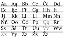 حرف q (با نام: کو)، v (با نام: فاو)، و x (با نام: ایکس) به الفبای لهستانی مرتبط نیستند، اما در برخی واژگان خارجی و نامهای تجاری استفاده میشوند. این حروف در وامواژهها به ترتیب اغلب به وسیله kw، w و ks جایگزین میشوند: (kwarc "quartz"، weranda "veranda"، ekstra "extra").
