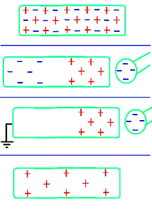۳- در آخرین مرحله ، سیم را از جسم رسانا را جدا کرده ، بنابراین بارهای مثبت در کل جسم توزیع می شود ، نتیجه می گیریم که برای شارژ یک جسم رسانا با بار مثبت ، با یک جسم دارای بار منفی به آن نزدیک می شویم و بالعکس .