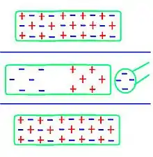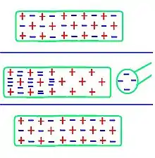 با جزئیات بیشتر ، در تصویر بالا در قسمت اول آن همان توزیع عادی بار مشاهده می کنیم ، اما تفاوت در این است که وقتی به جسم باردار نزدیک می شویم ، الکترون های آزاد حرکت می کنند (همانطور که گفتیم زودتر) و عدم تعادل در تعداد الکترونها و یونهای مثبت رخ می دهد که منجر به ظهور بار منفی در مکانی می شود که در آن چگالی بارهای منفی بیشتر است و در مکانی که تراکم بارهای مثبت بیشتر است ، نتیجه بار مثبت خواهد بود. از این رو ، حرکت الکترونها منجر به بار مثبت و منفی می شود همانطور که در تصویر نشان داده شده است.