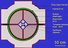 نوع دوم طرح فشار ماشین فشار مکعبی است. یک ماشین فشار مکعبی شش سندان دارد که همزمان فشار را بروی تمام رویههای یک حجم مکعبی شکل ایجاد میکند. اولین طرح ماشین فشار چند سندانی یک ماشین چهاروجهی بود که از چهار سندان برای همگرایی روی یک حجم چهاروجهی استفاده مینمود.[41] ماشین فشار مکعبی پس از مدت کوتاهی از آن ساخته شد تا حجم را تا جایی که میتوان فشار بپذیرد، افزایش داد. یک ماشین فشار مکعبی معمولاً کوچکتر از یک ماشین فشار کمربندی است و میتواند با سرعت بیشتری به فشار و دمای لازم برای ساخت یک الماس مصنوعی برسد. البته، ماشینهای فشار مکعبی به راحتی قابلیت ساخت در ابعاد بزرگتر را ندارند؛ حجم تحت فشار را میتوان با سندانهای بزرگتری افزایش داد اما این کار میزان نیروی لازم را برای سندانها تا که به همان فشار برسند، بالا میبرد. راه دیگر آن است که نسبت مساحت بر حجم مربوط به حجم تحت فشار را با استفاده از سندانهای بیشتری که به یک جسم افلاطونی همگرا میگردند، مثل یک دوازده وجهی، کاهش دهیم. البته، چنین ماشین فشاری شکل پیچید ای خواهد داشت و ساخت آن سختتر است.[42]