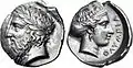 سکه نقره تترادراخما، ۳۶۰ قبل از میلاد، المپیا. روی سکه: سر زئوس با تاج گل برگ بو. پشت سکه: سر نیمف با پیشانیبند و OΛYMΠIA در سمت راست.