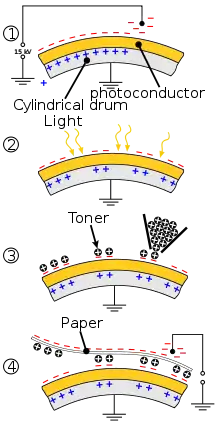 - بارگیری: یک بارالکتریسیته ساکن (۶۰۰ ولت یا بیشتر) بهطور منظم بر روی غلتک توزیع میشود.