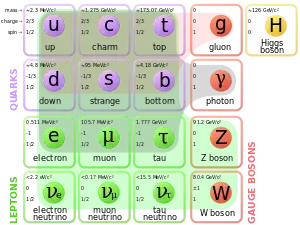 در مدل استاندارد فیزیک ذرات، الکترونها به گروهی از ذرات زیر اتمی به نام لپتونها تعلق دارند که ذرات بنیادی یا اولیه در نظر گرفته میشوند. الکترونها دارای کمترین مقدار جرم در میان لپتونهای باردار (و یا هر نوع ذره دارای بار الکتریکی) هستند و متعلق به اولین نسل ذرات بنیادی هستند.[69] دومین و سومین نسل لپتونهای باردار میون و تاو هستند که از نظر بار، اسپین و برهم کنش با الکترونها یکسان بوده ولی دارای جرم بیشتری میباشند. لپتونها از نظر نداشتن برهم کنش قوی با جزء دیگر تشکیل دهندهٔ ماده به نام کوارک تفاوت دارند. همهٔ اعضای گروه لپتونها فرمیون هستند زیرا همگی آنها دارای اسپین نیمهصحیح هستند؛ الکترون دارای اسپین ۱⁄۲ است.[70]
