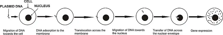الکتروترنسفر DNA به سمت سلول، DNA انتقال در غشاء، انتقال در عرض غشاء، انتقال DNA به سمت هسته، انتقال DNA در داخل غشای هسته و در نهایت بیان ژن. دما، پارامترهای پالسهای الکتریکی، تراکم DNA، بافر الکتروپورشن استفاده شده، اندازه سلول و توانایی سلولها برای بیان ژنهای انتقال یافته میتوانند کارایی الکتروترنسفر ژن را تحت تأثیر قرار دهند. درالکتروترانسفر ژنی در داخل محیط زنده نیز انتشار DNA از طریق ماتریکس خارج سلولی، خواص بافت و هدایت کلی بافت بسیار مهم است.