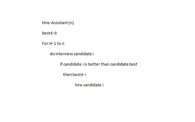 فرض کنید شما به استخدام یک منشی در شرکت خود نیاز دارید و چون تلاشهای گذشتهی شما بی نتیجه مانده است از یک آژانس کاریابی کمک میگیرید. این آژانس هر روز برای شما یک داوطلب استخدام میفرستد. شما با فرد متقاضی مصاحبه کرده و تصمیم میگیرید که او را استخدام کنید یا نه. شما هر بار برای مصاحبه با یک نفر باید مبلغ کمی به آژانس پرداخت کنید. شما میخواهید هر بار بهترین فرد ممکن را به عنوان منشی استخدام کنید و این کار با اخراج منشی قبلی و استخدام فرد جدید و پرداخت پول هم راه است. برای آن که همیشه بهترین فرد منشی استخدامی شما باشد بعد از مصاحبه با هر نفر اگر او از فرد قبلی بهتر بود او را استخدام میکنید. شما میخواهید هزینه این کار را قبل از شروع استخدام تخمین بزنید. در زیر یک الگوریتم ساده که گویای این عملیات است ارائه شدهاست: