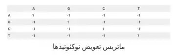 بهطور کلی همانطور که مشاهده میکنید برای تطابق امتیاز مثبت برابر با 1 و برای عدمتطابق امتیاز منفی برابر با -1 در نظر گرفته میشود. اصولا در نوکلئوتیدها تفاوتی میان انواع تطبیقناپذیریها قائل نمیشویم.