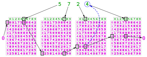 عدد را رقم به رقم پردازش میکنیم: رقم عدد را با ستون و رقم موقت را با سطر مطابقت میدهیم و عدد مورد نظر را از جدول استخراج میکنیم.