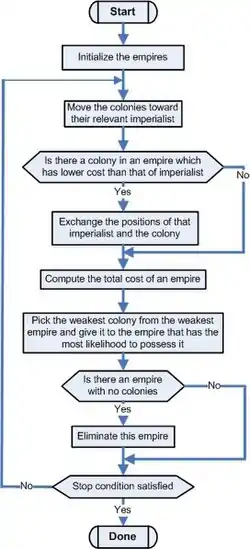 برای شروع الگوریتم، تعداد Ncountry کشور اولیه را ایجاد میکنیم. تا Nimp از بهترین اعضای این جمعیت (کشورهای دارای کمترین مقدار تابع هزینه) را به عنوان امپریالیست انتخاب میکنیم. باقیمانده Ncol تا از کشورها، مستعمراتی را تشکیل میدهند که هرکدام به یک امپراطوری تعلق دارند. برای تقسیم مستعمرات اولیه بین امپریالستها، به هر امپریالیست، تعدادی از مستعمرات را که این تعداد، متناسب با قدرت آن است، میدهیم. در شکل زیر نحوه تقسیم مستعمرات، میان کشورهای استعمارگر به صورت نمادین نشان داده شدهاست.[3]