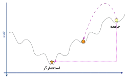 مستقل از اثرات و تبعات مثبت و منفی آن، استعمار به عنوان یک فرایند ذاتی در تاریخ بشر ایجاد شد، و در عین وارد کردن خسارتهای جبران ناپذیر به زیربناهای اساسی یک کشور (خصوصاً زیربناهای فرهنگی) در بعضی موارد اثرات مثبتی را نیز برای کشورها مستعمره داشت.[6] از دید بهینهسازی، استعمار بعضی از کشورها را که در یک دره معمولی تمدن قرار داشتند، خارج کرده و آنها را به یک حوزه مینیمم دیگر برد که در بعضی موارد وضعیت این حوزه مینیمم بهتر از موقعیت قبلی کشور مستعمره بود. اما به هر حال این حرکت مستلزم پیشروی مستعمره در راستای محورهای مختلف اقتصادی و فرهنگی به سمت یک امپریالیست قویتر بود، یعنی از میان رفتن بعضی از ساختارهای فرهنگی و اجتماعی. شکل زیر حرکت یک مستعمره به سمت استعمارگر قوی را نشان میدهد. این روند در الگوریتم رقابت استعماری در قالب سیاست جذب مدلسازی میشود.