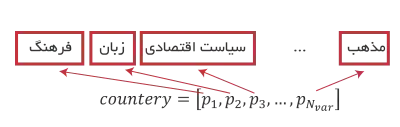 مقادیر متغیرهها در یک کشور، به صورت اعداد اعشاری نمایش داده میشوند. از دیدگاه تاریخیفرهنگی، اجزای تشکیل دهنده یک کشور را میتوان ویژگیهای اجتماعی– سیاسی آن کشور، همچون فرهنگ، زبان، ساختار اقتصادی و سایر ویژگیها در نظر گرفت. شکل زیر نحوه تناظر متغیرهای بهینهسازی مسئله با ویژگیهای اجتماعی سیاسی را نشان میدهد.
