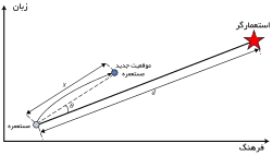 که در آن ß عددی بزرگتر از یک و نزدیک به ۲ میباشد. یک انتخاب مناسب میتواند ß=۲ باشد. وجود ضریب ß≥۱ باعث میشود تا کشور مستعمره در حین حرکت به سمت کشور استعمارگر، از جهتهای مختلف به آن نزدیک شود. همچنین در کنار این حرکت، یک انحراف زاویهای کوچک نیز با توزیع یکنواخت به مسیر حرکت افزوده میشود. یک نمای گرافیکی از اعمال سیاست جذب در الگوریتم رقابت استعماری در صفحه دو بعدی در زیر نشان داده شدهاست.[3]