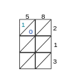 در این روش یک جدول مشبکی کشیده میشود و رقمهای دو عددی که میخواهیم آنها را در هم ضرب کنیم در بالا و سمت راست جدول کشیده میشود. جدول مشبکی ضرب دو عدد ۵۸ و ۲۱۳ به صورت زیر (تصویر مرحلهٔ اول) است. ما باید هر خانهٔ آن را به صورتی پر کنیم که با ضرب عدد بالای ستون و سمت راست سطر یکان عدد حاصل در پایین و دهگان آن در بالای خط موجود در خانه نوشته شود.