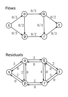 در گراف داده شده G با ظرفیت c و جریان f(u،v)=۰ برای یالی از به میخواهیم بیشترین جریان از منبع s به چاهک t را پیدا کنیم. بعد از هر مرحله در الگوریتم موارد زیر پیش میآید: