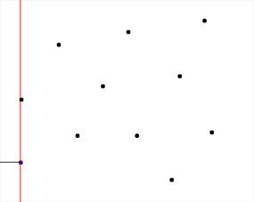 let be the transformation , where is the Euclidean distance between and the nearest site let be the "beach line" let be the region covered by site . let be the boundary ray between sites and . let be the sites with minimal -coordinate, ordered by -coordinate create initial vertical boundary rays while not IsEmpty() do ← DeleteMin() case of is a site in : find the occurrence of a region in containing , bracketed by on the left and on the right create new boundary rays and with bases replace with in delete from any intersection between and insert into any intersection between and insert into any intersection between and is a Voronoi vertex in : let be the intersection of on the left and on the right let be the left neighbor of and let be the right neighbor of in create a new boundary ray if , or create if is right of the higher of and , otherwise create replace with newly created in delete from any intersection between and delete from any intersection between and insert into any intersection between and insert into any intersection between and record as the summit of and and the base of output the boundary segments and endcase endwhile output the remaining boundary rays in