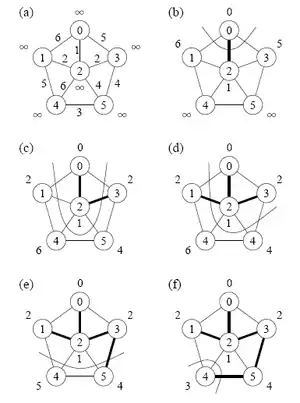 اگر در لحظه شروع {y={v1 باشد، لذا [nearest[i با ۱ و [distance[i با وزن لبه بین v1 و vi مقدار دهی اولیه میشود.همانطوریکه گرهها به Y اضافه میشوند،این دو ارائه برای ارجاع گره جدید در Y به نزدیکترین گره خارج از Y ، به هنگام (update)میشوند.برای معین کردن گرهای که باید به Y اضافه شوند ،در هر تکرار ،شاخصی که مقدار distance[i]1 ان مینیمم است را محاسبه میکنیم. این شاخص را vnear مینامیم. با مقداردهی [distance[vnear به۱- ، گره با شاخص vnear به Y اضافه میگردد . الگوریتم بالا این روال را پیادهسازی میکند