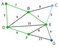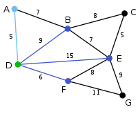 راس D بهطور دلخواه به عنوان نقطهٔ شروع انتخاب شدهاست. رئوس A، B، E، F همگی با یالی به D متصل هستند. A نزدیکترین راس به D است بنابراین همراه با یال AD برای درخت انتخاب میگردد. |
