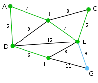 در این حالت انتخاب ما بین C، E، G میتواند صورت گیرد. فاصله C از B برابر ۸، فاصله E ازآن برابر ۷ و فاصله G از F نیز ۱۱ است. مشاهده میشود که E نزدیکترین راس است پس آن را همراه با کمان BE انتخاب میکنیم. |
