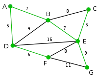 در پایان همه رئوس انتخاب شدهاند و درخت پوشای کمینه با رنگ سبز نشان داده شدهاست که وزنی برابر ۳۹ دارد. |