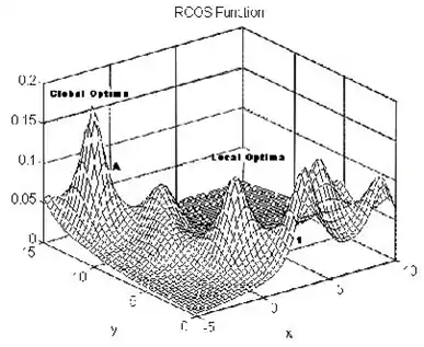 به شکل زیر توجه کنید. این منحنی دارای دو نقطه ماکزیمم میباشد؛ که یکی از آنها تنها ماکزیمم محلی است. حال اگر از روشهای بهینهسازی ریاضی استفاده کنیم مجبوریم تا در یک بازه بسیار کوچک مقدار ماکزیمم تابع را بیابیم. مثلاً از نقطه ۱ شروع کنیم و تابع را ماکزیمم کنیم. بدیهی است اگر از نقطه ۱ شروع کنیم تنها به مقدار ماکزیمم محلی دست خواهیم یافت و الگوریتم ما پس از آن متوقف خواهد شد. اما در روشهای هوشمند، به ویژه الگوریتم ژنتیک به دلیل خصلت تصادفی آنها حتی اگر هم از نقطه ۱ شروع کنیم باز ممکن است در میان راه نقطه A به صورت تصادفی انتخاب شود که در این صورت ما شانس دستیابی به نقطه بهینه کلی (Global Optima) را خواهیم داشت.