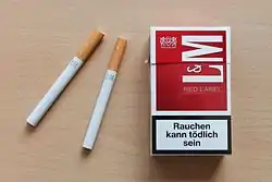 ![]() An old German pack of L&M cigarettes, with a German text warning which reads "Smoking can kill" | |