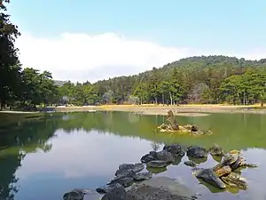 | Mōtsū-ji (毛越寺)[7][8][9][10] | Temple | Said to have been founded by Ennin in ۸۵۰; rebuilt by Fujiwara no Motohira in the twelfth century; its destruction by fire in 1226 was lamented in Azuma Kagami as the loss of a monument 'incomparable in our time'; the tweflth-century paradise garden, with stone-paved stream, pond, pebble beach, peninsula, island, and ornamental stones is a Special Place of Scenic Beauty; the site of an associated معبد شینتویی is a Special Historic Site | ![]() |