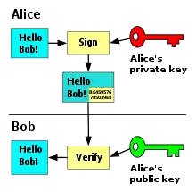 باب دو چیز را دریافت می کند: هم پیام و هم امضا. باب از کلید عمومی آلیس استفاده میکند تا از اصالت پیام مطمئن شود، یعنی پیام رمزگشاییشده توسط کلید عمومی، با پیام اصلی دقیقا منطبق است.