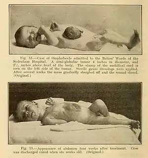 | نوزاد قبل و بعد از درمان جراحی اگزومفال. | |
