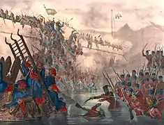 با این حال، این دوره به صورت فاجعهباری پایان یافت. وزیر اعظم کارا مصطفی پاشا در سال ۱۶۸۳ ارتش بزرگی را فراهم آورد و برای بار دوم تلاش کرد تا وین را محاصره کند. تأخیر پیش آمده در محاصره وین باعث شد تا ارتش عثمانی توسط نیروهای متحد هابسبورگ، المانی و لهستانی به خاک و خون کشیده شود و اتحادیه مقدس به یک پیروزی درخشان دست پیدا کند. با عهدنامه صلح که جنگ موسوم به «جنگ بزرگ با ترکان» پایان داد[76]، عثمانی بخشهای وسیعی از خاک خود را از دست داد که بیشتر آنان را هرگز نتوانست مجدداً فتح کند.[77] مصطفی دوم در میان سالهای ۱۶۹۶ تا ۱۶۹۶ در یک اردوکشی به قصد تلافی شکست در وین، تلاش کرد تا به هابسبورگها در مجارستان حمله کند اما با شکست در نبرد زنتا، این لشکرکشی نیز فاجعه آمیز به پایان رسید.[78]