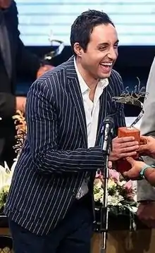 ![]() امیرحسین رستمی در جشن پایان سریال شهرزاد در حال دریافت جایزه از دستان سروش صحت | |