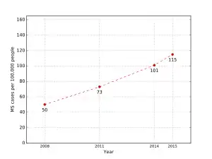 |coauthors=ignored (|author=suggested) (help); Check date values in:|date=(help) - Rosati G (2001). "The prevalence of multiple sclerosis in the world: an update". Neurol. Sci. 22 (2): 117–39. doi:10.1007/s100720170011. PMID 11603614. Unknown parameter