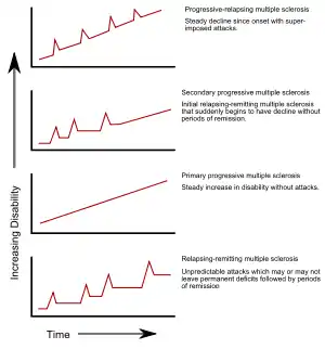 اماس پیشرونده ثانویه در حدود ۶۵٪ از افراد مبتلا به اماس عودتکننده-بهبود یابنده اولیه، که در نهایت بدون هیچ دوره مشخصی از بهبودی بین حملات حاد خود کاهش نورولوژیک پیشرونده را تجربه میکنند.[1][5] ممکن است عودتهای گاه به گاه و بهبودیهای کوچکی دیده شود.[5] شایعترین مدت زمان بین شروع بیماری و تبدیل آن از اماس عودتکننده-بهبود یابنده به اماس پیشرونده ثانویه ۱۹ سال است.[49] زیرمجموعه پیشرونده اولیه تقریباً در ۱۰–۲۰٪ از افراد ظاهر میشود و بعد از علائم اولیه بهبودی حاصل نخواهد شد.[18][50] پیشرفت از کار افتادگی از زمان شروع بیماری، بدون بهبودی بیماری یا وجود بهبودیهای موقتی و کم از ویژگیهای این نوع از اماس است.[5] معمولاً سن شروع اماس پیشرونده اولیه بالاتر از سن شروع نوع عودتکننده-بهبود یابنده است. سن شروع آن مشابه با سن شروع نوع پیشرونده ثانویه در اماس عودتکننده-بهبود یابنده، حدود ۴۰ سالگی، است.[1]