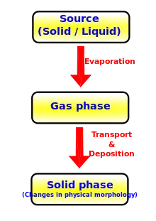 - انتقال و جابجایی بخارهای حاصله :طی این مرحله اتمهای تبخیر شده در یک مسیر مشخص به سمت مادهای که لایه نشانی خواهد شد، حرکت میکنند. در مواردی که از فلز استفاده میشود اتمهای بخار شده، بعد از جابجایی با گازهایی همچون اکسیژن، نیتروژن و … واکنش میدهند.