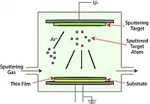 - رسوب پراکنده: در آن، یک تخلیه پلاسمای تابش (معمولاً در اطراف «هدف» توسط یک آهنربا موضعی قرار میگیرد) مادهای را که بخاطر انبساط بعدی به وجود میآید، پر میکند.
