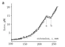 در ابتدا وقتی RNA را توسط دستهها کشیده میشوند، نیرو به آرامی متناسب با طول RNA افزایش مییابد، کاملاً به شکل نیروی فنر. این منحنی در شکل زیر دیده میشود. اما در نیروی ۱۴٫۵ پیکونیوتن یک ناپیوستگی ناگهانی در نمودار نیرو برحسب طول مشاهده میشود. تغییرات طول در این پدیده (۲۰ نانومتر) مطابق با طول پیشبینی شدهٔ بخشهای گرهمو مانند RNA میباشد. بدین شکل میتوان تخمینی از ابعاد هر ساختار در RNA بدست آورد که روشی بسیار خلاقانه و زیبا میباشد. معمولاً در دیدگاه فیزیکی، این پدیده را با یک سیستم دو حالته مدلسازی میکنند.[3][4]