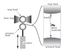 در یک آزمایش خاص، از دستگاه تله نوری استفاده میکنند که امکان دستکاری اجسام بسیار ریز (مانند دانههای پلی استایرن با قطر ۳ میکرومتر) را میدهد. مهرههای هدف پرتوهای نور ورودی را خم میکنند، درنتیجه، تکانهٔ نور به آن منتقل میشود و هر مهره بر این اساس نیرویی را احساس میکند. یک جفت لیزر مختلفالجهت با هدفگیری مشترک، میتواند مهرهها را در مکان مشخصی نگه دارد. از آنجا که RNA برای گیر افتادن در تله نوری بسیار کوچک است، آزمایشگران آن را به «دستههای مولکولی» ساخته شده از DNA وصل میکنند. همانطور که در شکل ترسیم شدهاست، RNA میتواند در خود بپیچد و ساختاری گرهمو مانند ایجاد کند.[3][4]