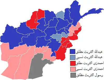 | نتیجهٔ دور نخست به تفکیک ولایت بر پایهٔ نامزد پیروز | |||||||||||||||||||||||||||||||||||||||||||||||||||||||||||||||||