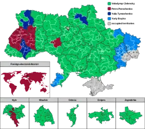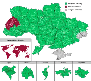 ۳۴٬۵۴۴٬۹۹۳ نفر واجد شرایط رای دادن در انتخابات بودند.[4] اما تقریباً حدود ۱۲ درصد از رایدهندگان واجد شرایط با توجه به الحاق کریمه به فدراسیون روسیه در سال ۲۰۱۴ و اشغال بخشهایی از استان دونتسک و استان لوهانسک، در انتخابات شرکت نکردند. در حالی که هیچ کاندیدایی اکثریت مطلق آرا را کسب نکرده بود، در روز ۲۱ آوریل ۲۰۱۹، انتخابات برگزار شد و دو کاندیدا، ولودیمیر زلنسکی و رئیسجمهور فعلی، پترو پروشنکو به مصاف یکدیگر رفتند. بر اساس نظرسنجیها و نتایج اولیه از کمیسیون مرکزی انتخابات، در دور دوم زلنسکی که حزبی را با نام «خادم مردم» تأسیس کرده بود و با شعار مبارزه با فساد نامزد انتخابات ریاستجمهوری اوکراین (۲۰۱۹) شد با حدود ۷۳/۱۹ درصد آراء برنده انتخابات ریاستجمهوری اوکراین (۲۰۱۹) گردید.[5][6]