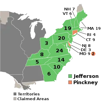 | نقشه نتایج انتخابات ریاست جمهوری. سبز نشاندهندهٔ ایالات برندهٔ جفرسون سبز تیره نشاندهندهٔ ایالات برندهٔ پینکنی. اعداد نشاندهندهٔ تعداد آرای گزینندگان اختصاص داده شده به هر ایالت است. | ||||||||||||||||||||||||||||||||||||||||||