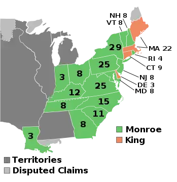 | نقشه نتایج انتخابات ریاست جمهوری. سبز نشاندهندهٔ ایالات برندهٔ مونرو، نارنجی سوخته نشاندهندهٔ ایالات برندهٔ کینگ، اعداد نشاندهندهٔ تعداد آرای گزینندگان اختصاص داده شده به هر ایالت است. | ||||||||||||||||||||||||||||||||||||||||||