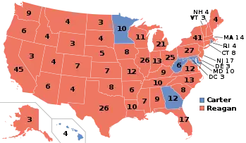 | نقشه نتیجه انتخابات. قرمز نشاندهندهٔ ایالات برده شده توسط ریگان/بوش است، آبی ایالات برده شده توسط کارتر/موندیل را نشان میدهد. اعداد نشان دهنده تعداد الکتورهای مجمع گزینندگان در هر ایالت هستند. | |||||||||||||||||||||||||||||||||||||||||||||||||||