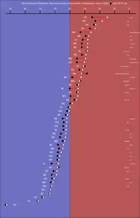 منبع: Exit polls conducted by Edison Research of Somerville, N.J. , for the National Election Pool, a consortium of ABC News, Associated Press, CBS News, CNN, Fox News,[58] and NBC News.[59] Total vote and results by region are based on the United States presidential election, 2012 section of this article.